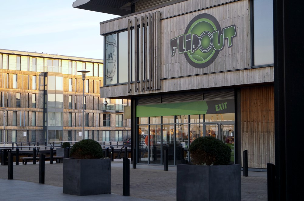 A local building company asked us to carry out this trampoline centre shop front installation. This is part of the on going development at the Chatham Dockside Shopping Outlet. We installed 8 new shop fronts on the ground and first floors. Each shop front had to have the same profile and be the same colour as shop fronts previously installed in the area.